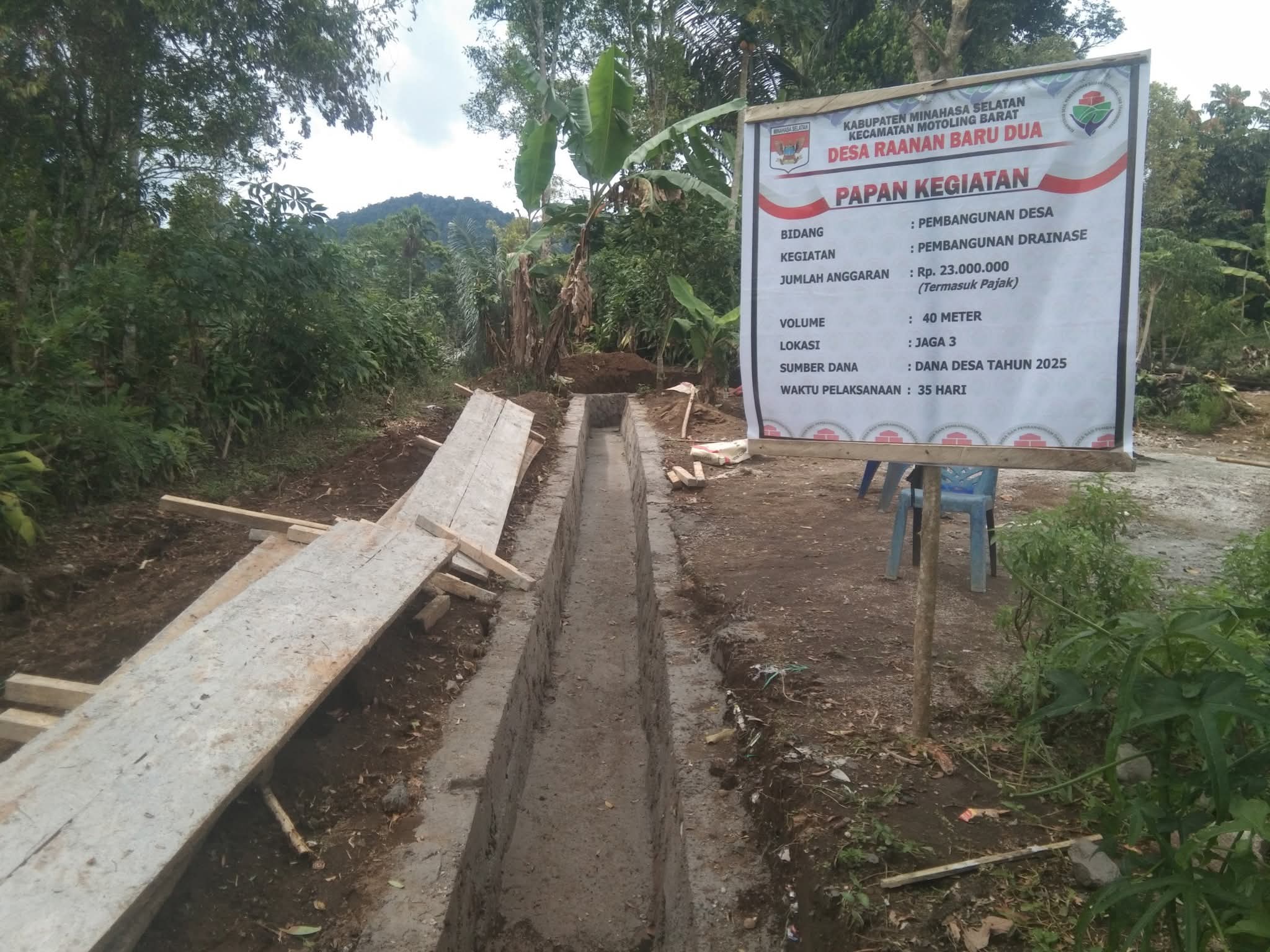 Hukum tua (Kumtua) Desa Raanan Baru Dua Alvian Sengkey ST mengatakan bahwa, pembangunan drainase menggunakan anggaran dana desa (DD) Tahun 2025 sekitar kurang lebih Rp.23.000.000.