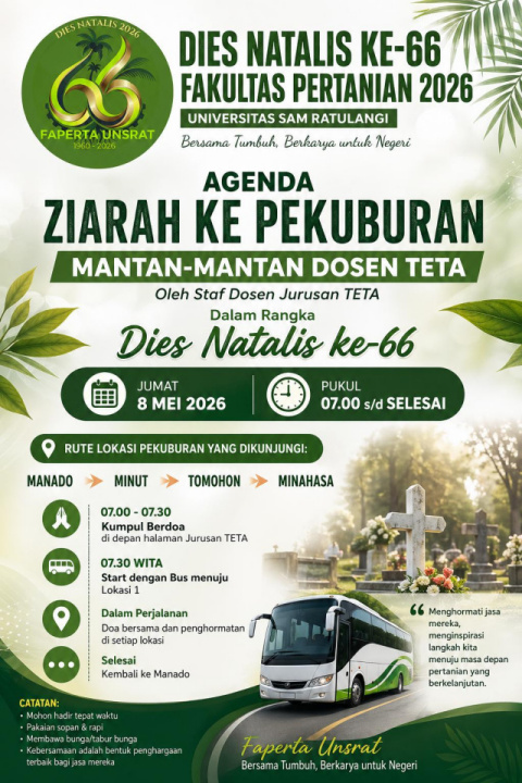 Koordinator Seksi Ziarah dan Temu Alumni, Dr. Herry Pinatik, menjelaskan bahwa kegiatan ziarah merupakan tradisi tahunan yang sudah berlangsung lama. Rangkaian acara ini akan mencakup ziarah ke makam para mantan dosen yang telah lebih dulu meninggal. Selain itu, dijadwalkan secara khusus ziarah ke pekuburan mantan-mantan Dekan Fakultas Pertanian Unsrat.