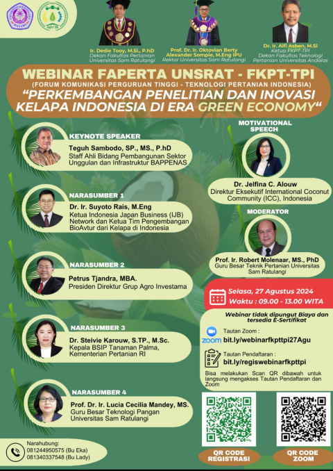 Hadir pada Webinar, Ketua Pengurus Pusat FKPT-TPI sekaligus Dekan Fakultas Teknologi Pertanian Andalas Dr Ir Alfi Asben MSi. Dekan Fakultas Pertanian Unsrat Ir Dedie Tooy MSi PhD yang telah mengagendakan webinar ini dilaksanakan di Unsrat Manado.